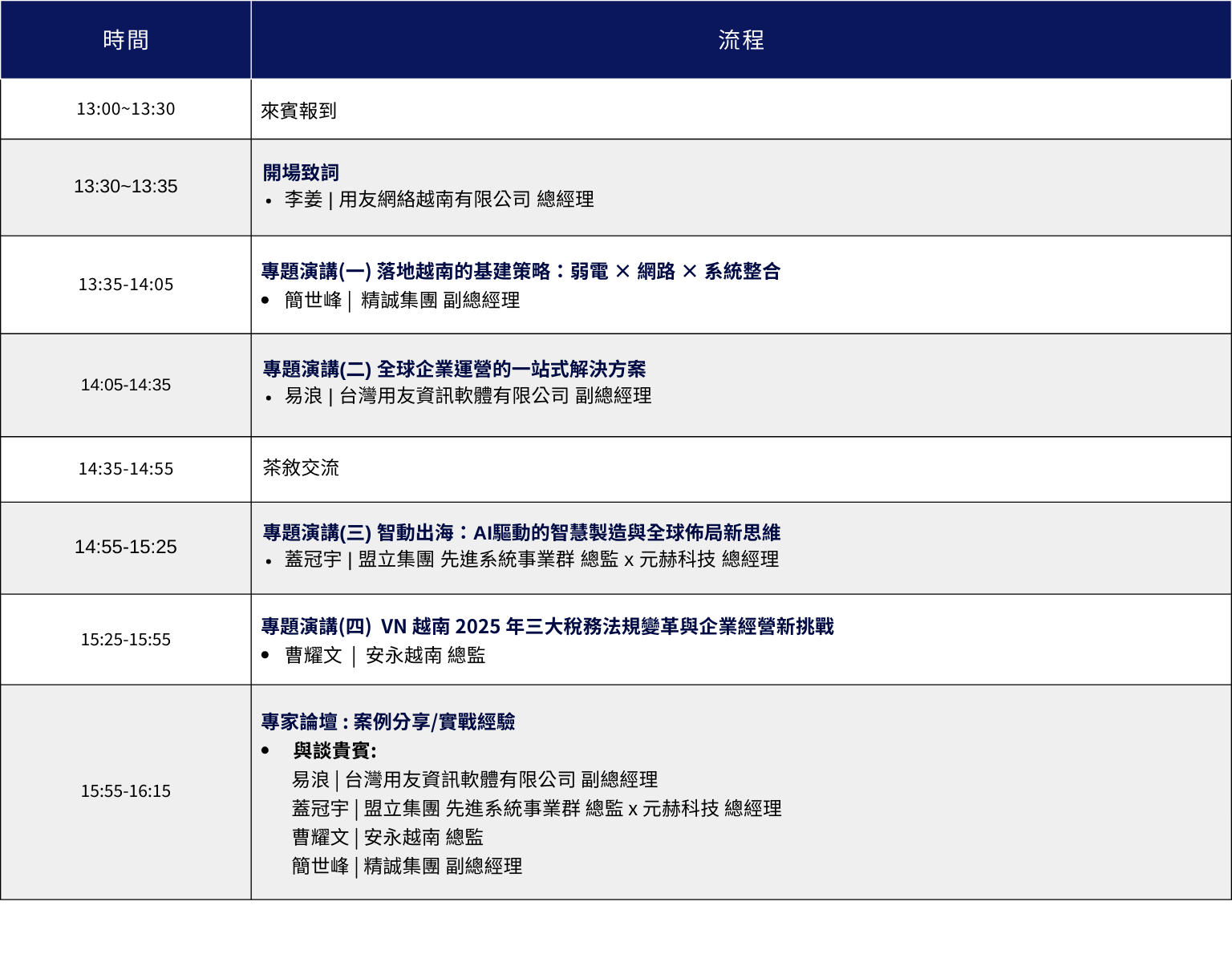 「六城聯航·台商合規發展與轉型」論壇越南場,將匯聚EY安永越南、盟立集團、元赫科技、精誠資訊與台灣用友等產業與專業顧問力量精誠資訊與台灣用友等產業與專業顧問力量,深入探討企業在全球經營中面臨的挑戰與機遇,並分享最佳實踐與策略,協助台商以合規為基礎,開拓新格局。